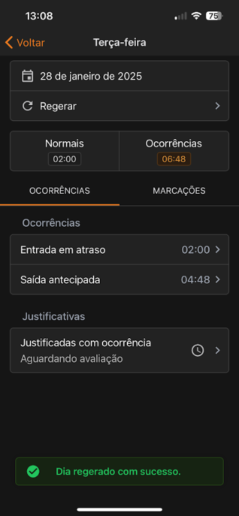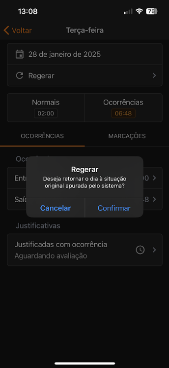Para realizar o processo, entre no espelho de um colaborador e selecione o dia que deseja regerar. Feito isso, clique em Regerar e Confirme.