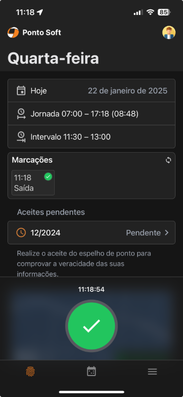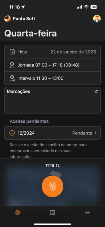 O método mais comum de Registro de Ponto no aplicativo Ponto Soft Mobile é a função de pressionar por aproximadamente dois segundos o ícone da biometria presente na tela inicial do aplicativo.