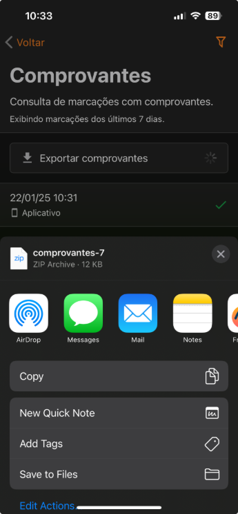 Os comprovantes poderão ser visualizados pelo próprio aplicativo, exportados por algum outro aplicativo ou ainda, será possível efetuar o download para o aparelho.