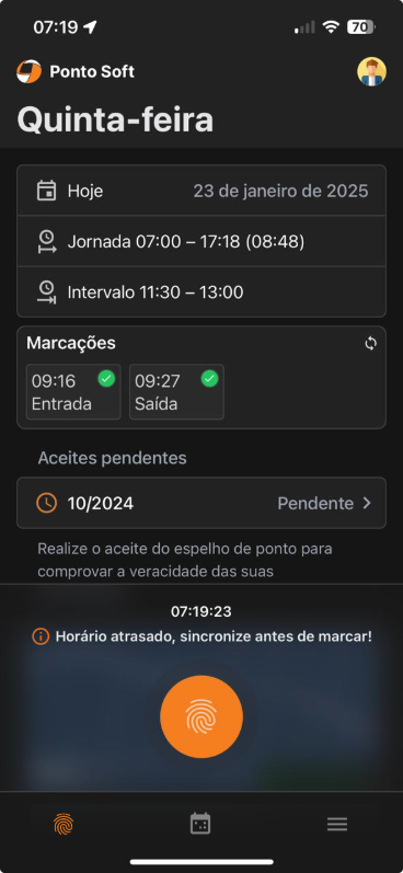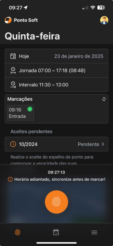 Se o dispositivo estiver com o horário incorreto, será exibido um aviso de relógio na tela de Registro de Ponto.
