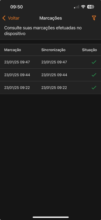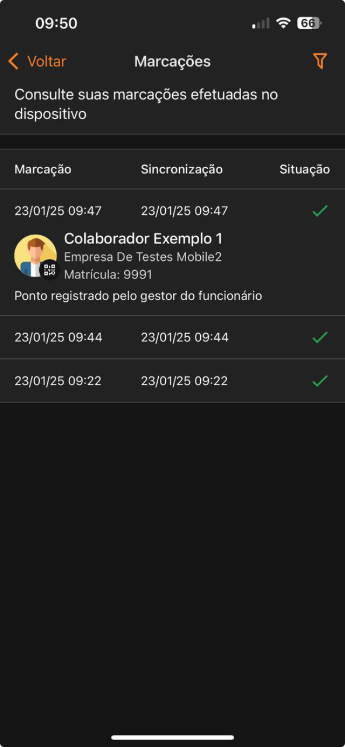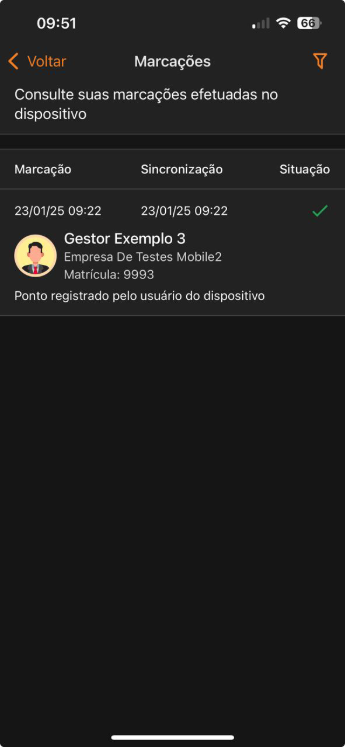 Ao clicar em Marcações Locais, será possível verificar as marcações realizadas pelo usuário e a situação de sincronização das mesmas.