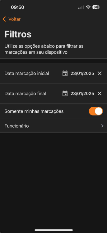 Além da seleção de Período, é possível determinar que sejam exibidas apenas as marcações do próprio usuário, o que pode ser útil para Gestores que realizam marcações por QR Code.