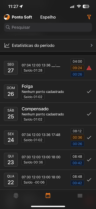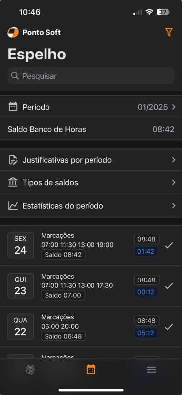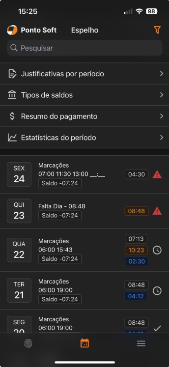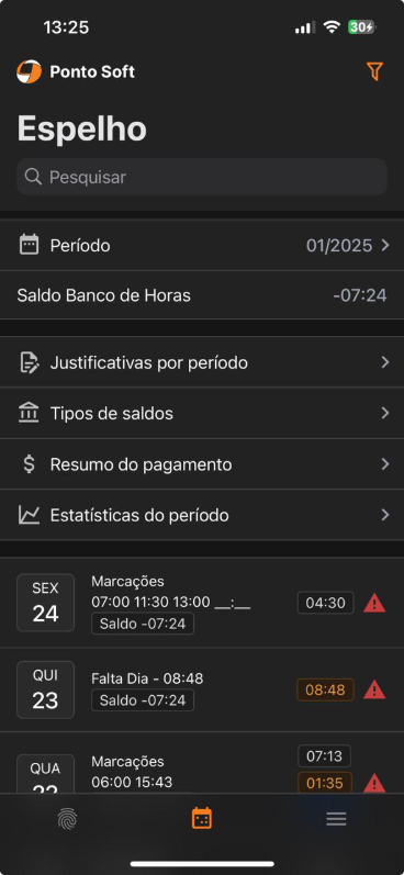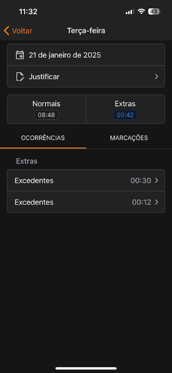 O primeiro passo é selecionar o dia em questão no Espelho de Ponto. Após selecioná-lo, será aberta a tela de justificativas do dia.