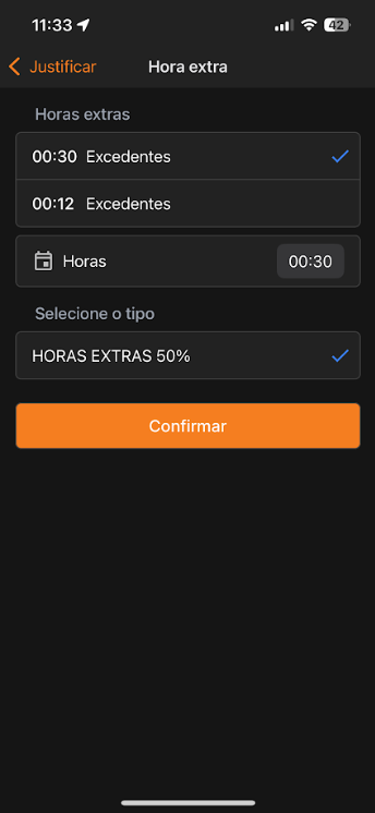 O primeiro passo será selecionar a hora extra desejada, e logo abaixo, deverá ser selecionado o novo tipo de hora excedente. Feito isso, clique em Confirmar.
