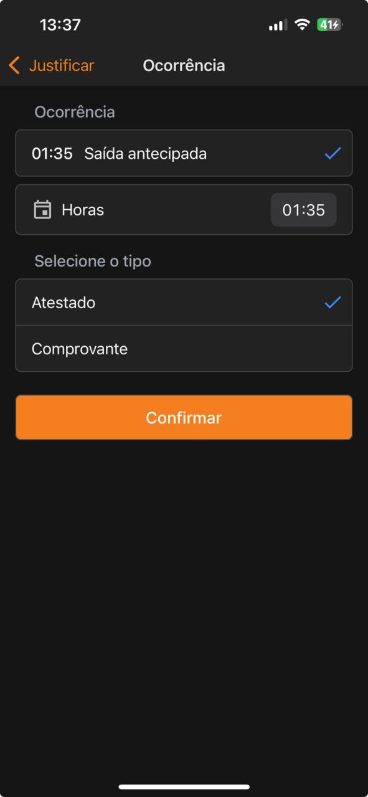 O primeiro passo será selecionar a ocorrência desejada, e em seguida, defina o tipo de justificativa e clique em Confirmar. Feito isso, será possível adicionar outra justificativa, ou então, finalizar o processo clicando em Salvar.