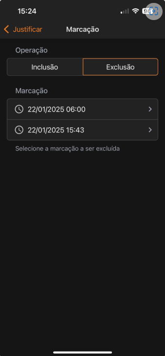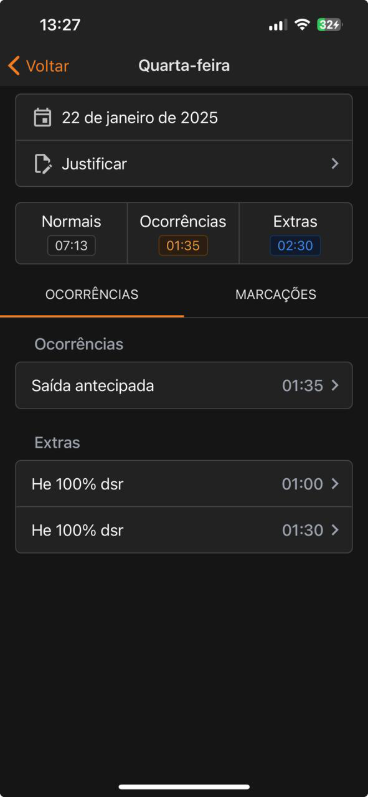 As justificativas com Marcação permitem a solicitação de ajustes em dias inconsistentes, adicionando ou removendo registros de ponto.