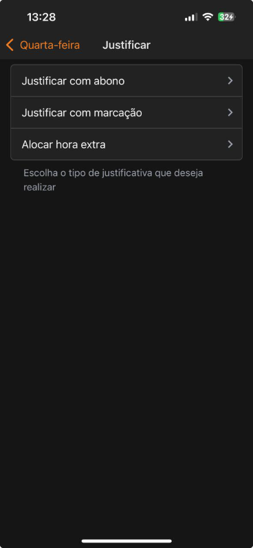 Justificar com Marcação- Permite a solicitação de inclusão e remoção de Marcações.Justificar com Abono- Permite a solicitação de lançamento de Ocorrências.Alocar Hora Extra- Permite a solicitação de aprovação de Horas Extras.