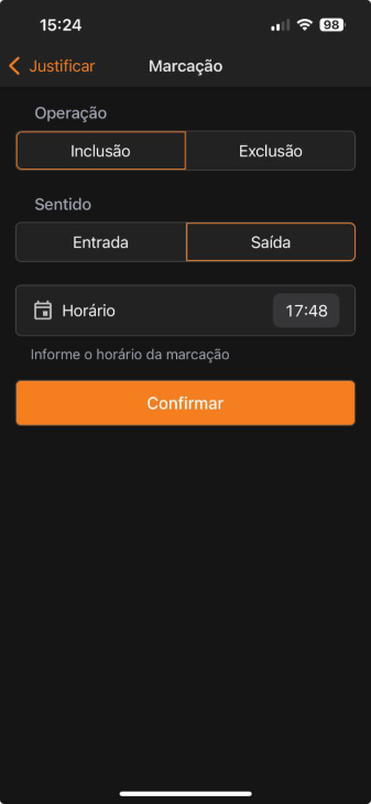 - Inclusão: Selecione o sentido da marcação (Entrada ou Saída), selecione o horário e clique em