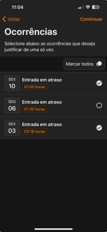 Clique em Marcar Todos, ou então, selecione as ocorrências desejadas individualmente, e clique em Continuar.